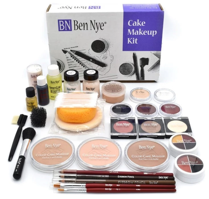 Cake Makeup Kit by Ben Nye. This kit offers a range of products including creme contours, MagiCake Aqua Paint contours, a classic collection of character and effects colors, and a useful assortment of accessories and tools. This generous ensemble provides enough makeup for dozens of straight, beauty and character designs.