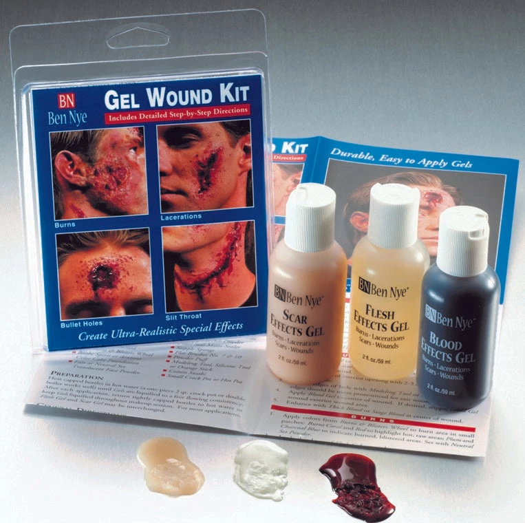 By Ben Nye. Design durable and realisitc lacerations, bullet holes, burns, wounds, and scars with this useful pack of gels. Wounds may be pre-made. Detailed instructions included. Three 2 ounce bottles, 30 to 50 applications per ounce.