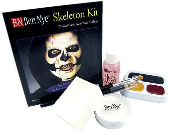 Create friendly or fearsome creatures with professional makeup and step-by-step directions. By Ben Nye.Components: Skeleton White Foundation, Three Color Skeleton Palette, Black Pencil, Flat Brush, Sponge Applicators, Quick Cleanse, Color Directions. HK-4 Applications: Minimum 4-6.