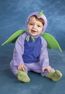 Costume includes lavender and purple walker with attached green wings and hood with green dragon scales.