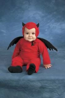 Costume includes red walker with attached black wings and hood with devil horns.