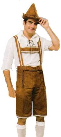 Costume includes hat, shirt, short-overall and lederhoisen.