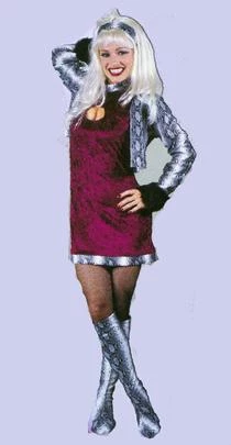 Costume includes velvet dress, jacket, boot tops and headpiece.