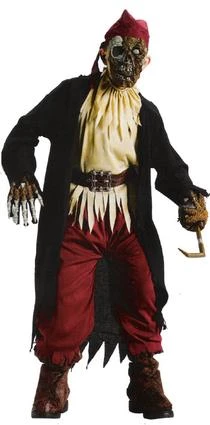 Costume includes jacket, jabot, pants, mask, boot covers, bandana, bone glove and stump with hook.
