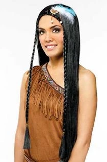 Long black wig with headband and feather.