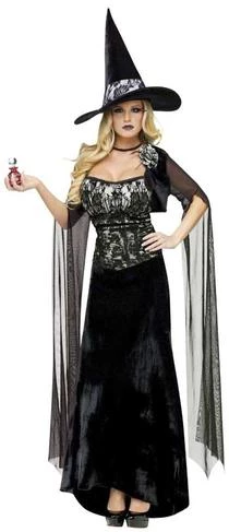 Costume includes velvet and lace gown, shrug and witch hat. (Potion bottle not included)