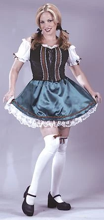 Costume includes velvet corset with lace, skirt and pair of lycra stockings.