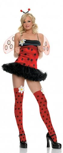 Petticoat tube dress, polka dot stockings with daisy applique, bug headpiece and translucent wings.