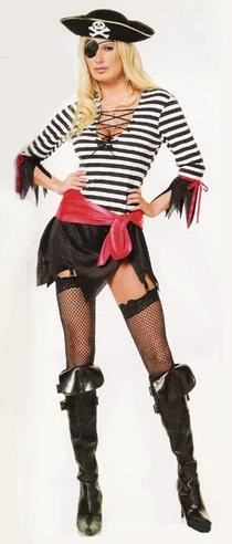 Costume includes lace-up front gartered dress, sash, hat and eye patch. (Boot tops not included.)
