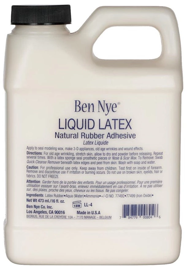 Liquid Latex by Ben Nye is multi-functional. Apply to stretched skin for aging, extreme blisters and wounds. Liquid Latex by Ben Nye is excellent for sealing Nose and Scar Wax or to mold prosthetics.
