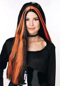 24 inch black witch wigh with orange streaks.