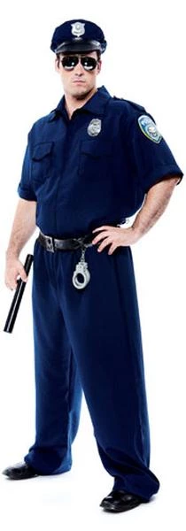 Costume includes hat, top, pants, handcuffs, badge and utility belt.
