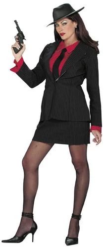 Costume includes pin-striped skirt, jacket, red blouse and black EVA foam fedora. (Gun and stockings not included.)