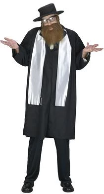 Costume includes flannel coat, satin scarf, hat with attached payiss and matching facial hair. (Glasses not included.)