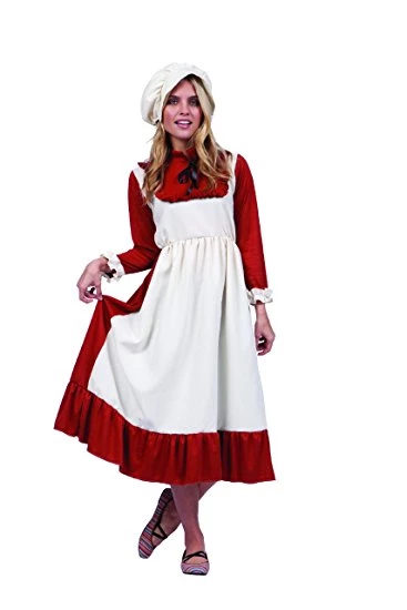 Zipped rust long sleeved dress with attached beige apron, beige bonnet, made of 100% woven poly poplin