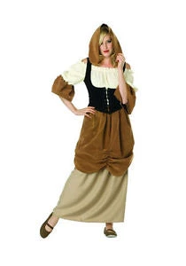 Tavern maiden/hooded peasant. Poplin off white top with camel dress, attached suede light brown outer skirt, black flock vest, hood