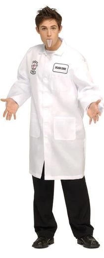 Costume includes lab coat and tongue. Patch on coat says Orgasm Donor.