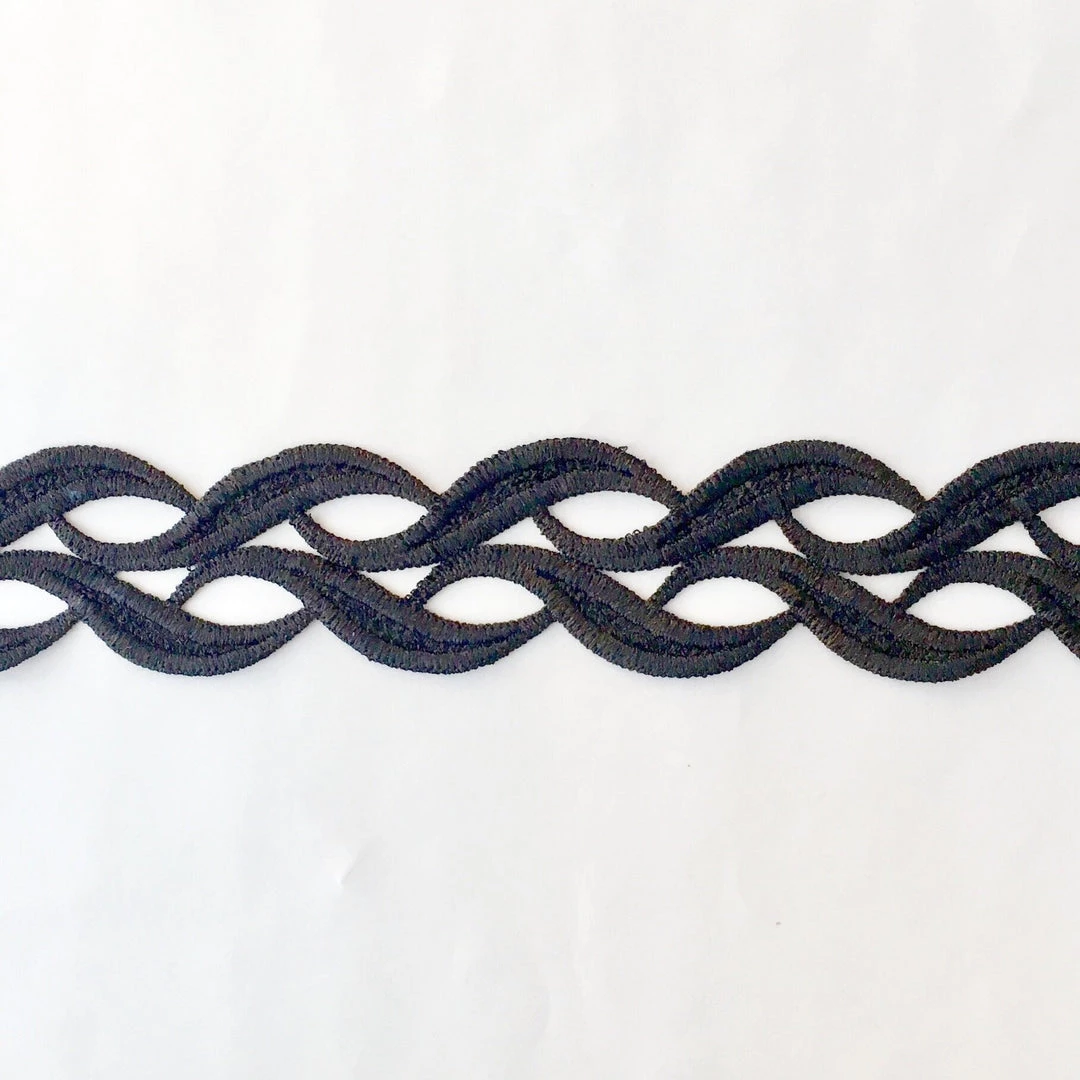 Black woven trim that interlaces with each piece to create a unique woven appearance. Can be used on garments, costumes, or for decor. 2” wide