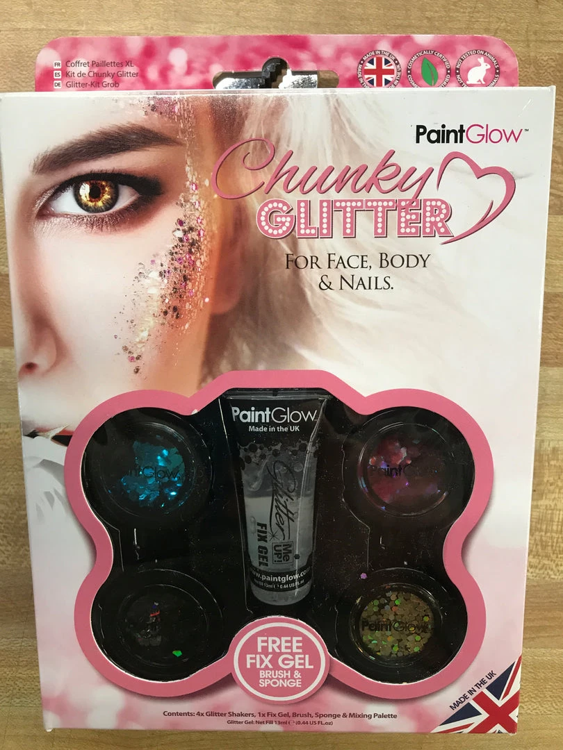 Paint Glow Cosmetic Chunky Glitter is holographic and iridescent glitter in a hexagonal shape. Simple to apply or remove; simply use a little Vaseline or moisturiser, or a specific Glitter Fix Gel, and stick the glitter wherever desired. Dermatologically tested, 100% cruelty free makeup.