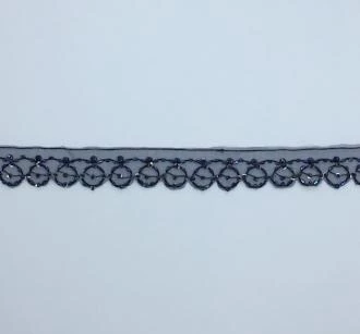 Scalloped bead trim is made up of beads in a delicate pattern gently making large swirls on mesh. 1″ wide. Sold by the yard.