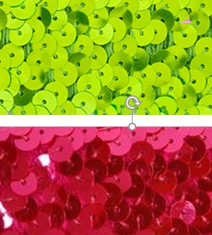 1 1/2″ Fluorescent Sequin Trim (Stretch) will glow under blacklight. Sold by the yard. Florescent Cerise (hot pink) and Neon Green