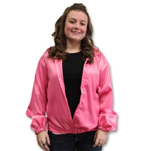50’s Pink Ladies Jacket is a beautiful pink satin with logo on back. Velcro closure at bottom. Elastic waist and wrists. NOTE: For copyright reasons, the patch on back says “Pink Satin Ladies”.