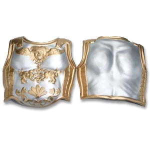 Armor Set includes a chest and back plate that attaches with ties at shoulders and waist. Armor is made of a soft plastic material with raised gold decoration on a silver background. Great for the Roman era. 24″H x 22″W (approx)