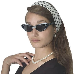 Bobby Soxer Kit includes cat eye glasses, polka dot neck tie, pearl necklace & clip on earrings. One stop kit to complete your 50’s look.