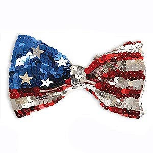This sparkly flag bow tie is made of sequins in red, blue and silver to signify the American flag. Accented with silver stars. Elastic neck band. 3″H x 5″W