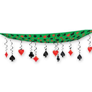 Casino Ceiling Decor displays hearts, spades, diamonds and clovers on a banner for hanging. 12″H x 12’L