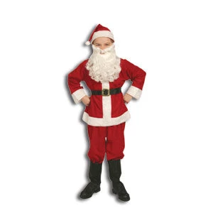 This Economy Child’s Santa Suit is made of red flannel with white plush trim. Includes pullover coat, pants, hat, belt, boot tops and a beard & mustache set. Dry clean only.