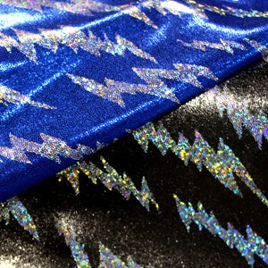 Dancing Lightning Spandex is an eye-catching foil spandex with a holographic zig-zag print. 80% Poly, 20% Spandex. 58″ wide.