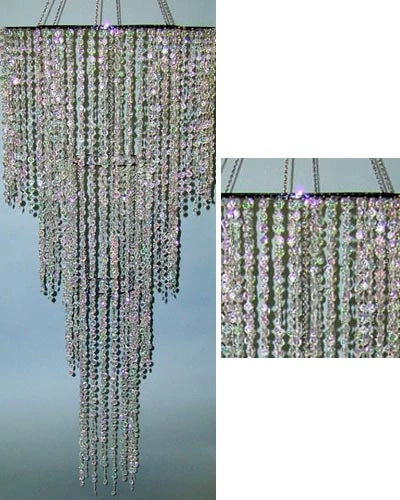 This Chandelier is the newest addition to our chandelier line and displays beautifully with its crystal iridescent beads. 24″Diameter x 4’6″L, 6’Long with hanging chain. Comes with cord and socket that takes a 75 watt maximum standard household bulb. (bulb not included)