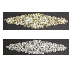 Diamond Rhinestone Motif is a delicate display of tiny beads and rhinestones. Perfect for dance, skate or formal wear. Sold individually. 11 1/2″ x 3 7/8″