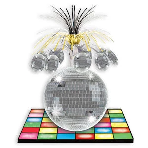 Disco Ball Centerpiece party decoration displays a mylar fountain for added shimmer. 13″H