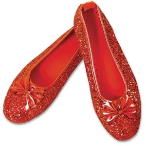 Dorothy Shoes (Deluxe) are a slipper style shoe made of a metallic weave trimmed with a gathered red bow. Intended as the Ruby Red Slippers from The Wizard of Oz. Adult sizing.