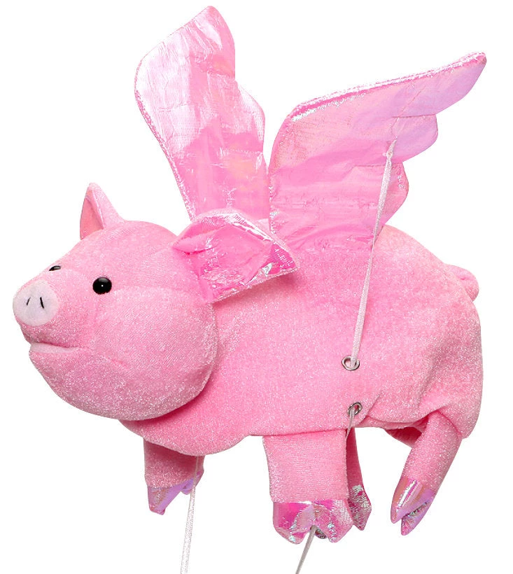 Flying Pig Hat in soft pink plush fabric with flapping wings. One size fits most with elastic edge.