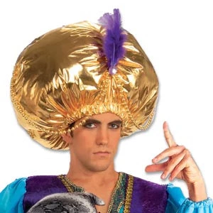 Giant Turban will help you be the top shiek for your Arabian show or costume party. Made of gold foil fabric draped with gold beads and accented with a royal purple feather. One size fits most.