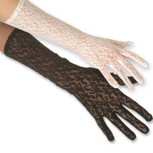 Lace Glove in elbow length. Made of stretch lace and measures 15″L from fingertip.