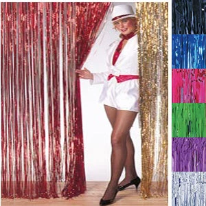 Metallic Fringe Curtain, or rain curtain, is flame-resistant and has a rod pocket for hanging. 8’H x 3’W. 1 ply. 3/16″W fringe. Hint: Piece them together to fit your particular area.