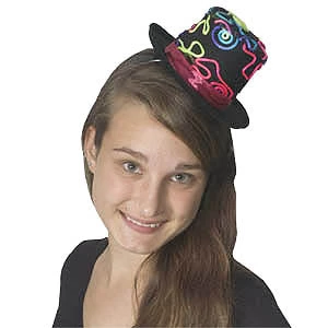 Neon String Top Hat (Mini) on headband. Adorable version can be worn on side or on top of head. Eye-catching with or without blacklight. One size fits most. 3″H