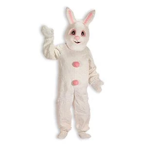 One-piece Bunny / Rabbit Mascot Suit is made of acrylic pile plush with a zipper back. It includes a foam mascot head, mitts, and shoe covers. White Bunny: White body with two pink pom-poms on the front and one pink for cotton tail. Pink Bunny: Pink body with white acrylic plush tummy and one white pom-pom for cotton tail.