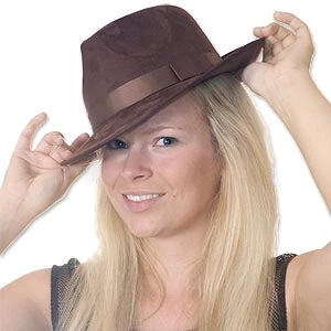 Faux Suede Fedora. This hat has an expensive look at a great price. Sturdy brown hat with matching ribbon. Great for the time traveling British doctor. One size fits most. 5″H