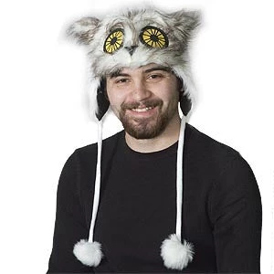 Furry Owl Hoodie Hat with pom pom ties. One size fits most.