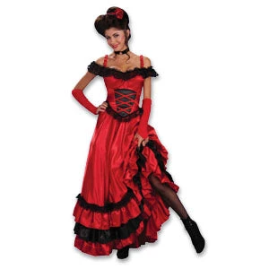 Saloon Sweetie for the wild west party girl. Satin dress with corset belt, glovelets and headpiece with rose. One size fits up to size 12 with stretch elastic.