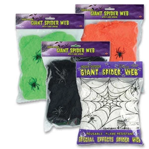 Spider Webbing with spiders. This is the same material used in TV shows and movies. Just pull and stretch for desired effect. Includes 4 plastic spiders. Flame resistant.