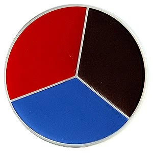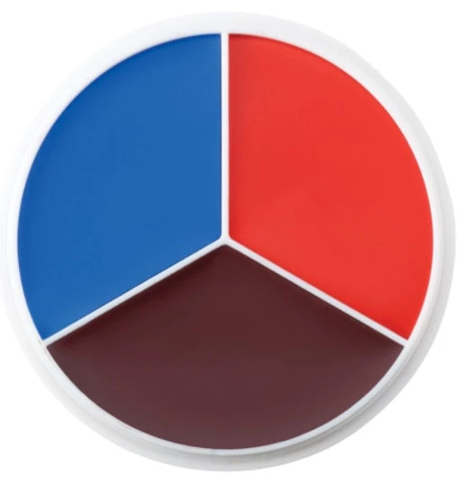 Trauma Simulation Wheel by Ben Nye, features 3 colors: FX-5 Dark Burgundy, CL-13 Fire Red, CL-19 Blue. Set with Neutral Set Powder, remove with Quick Cleanse. EW-07