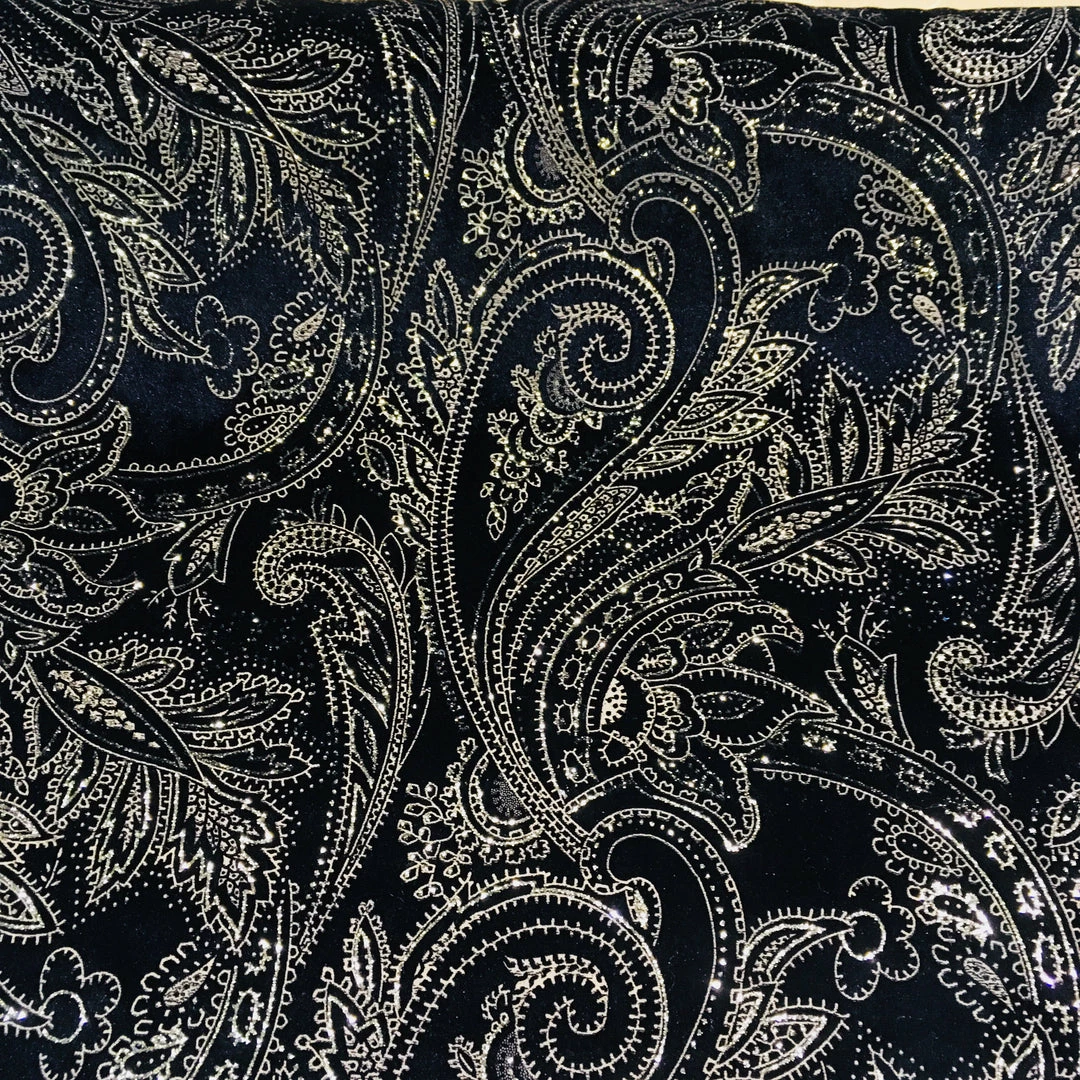 Black stretch velvet with beautiful swirling patterns and dots in glitter. Hand wash, 58” wide.