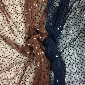 Pleated Tulle w/Sequins. Sheer stretch with small puckered pleats. 60″Wide