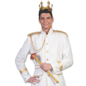 Prince Charming Jacket in white twill polyester with poly lining. Adorned in gold trim and buttons. Also suitable for foreign leader. Belt included. Approx 33″L